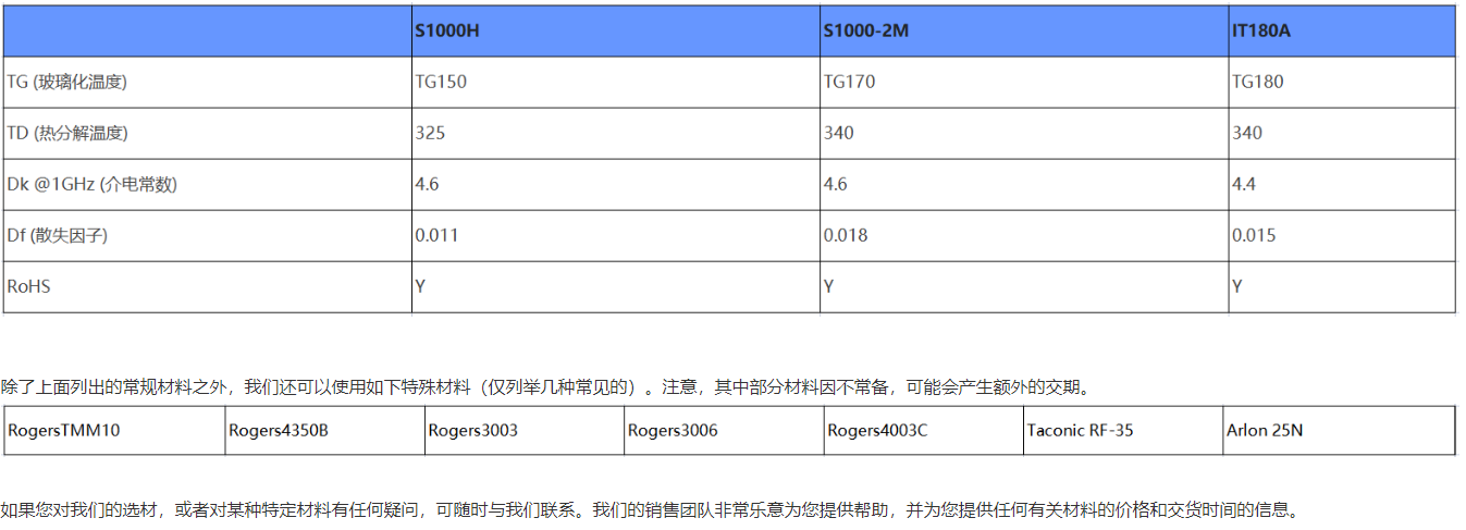 What differentiates Juyuan Union Technology (Shenzhen) Co., Ltd. from our competitors? Often, many processing plants prioritize low costs, neglecting quality and service. Juyuan Union strives to minimize costs while providing the highest quality PCB fabrication and soldering. When selecting PCB boards, we use the highest quality boards available and refuse to use low-quality boards. The table below lists our standard materials.