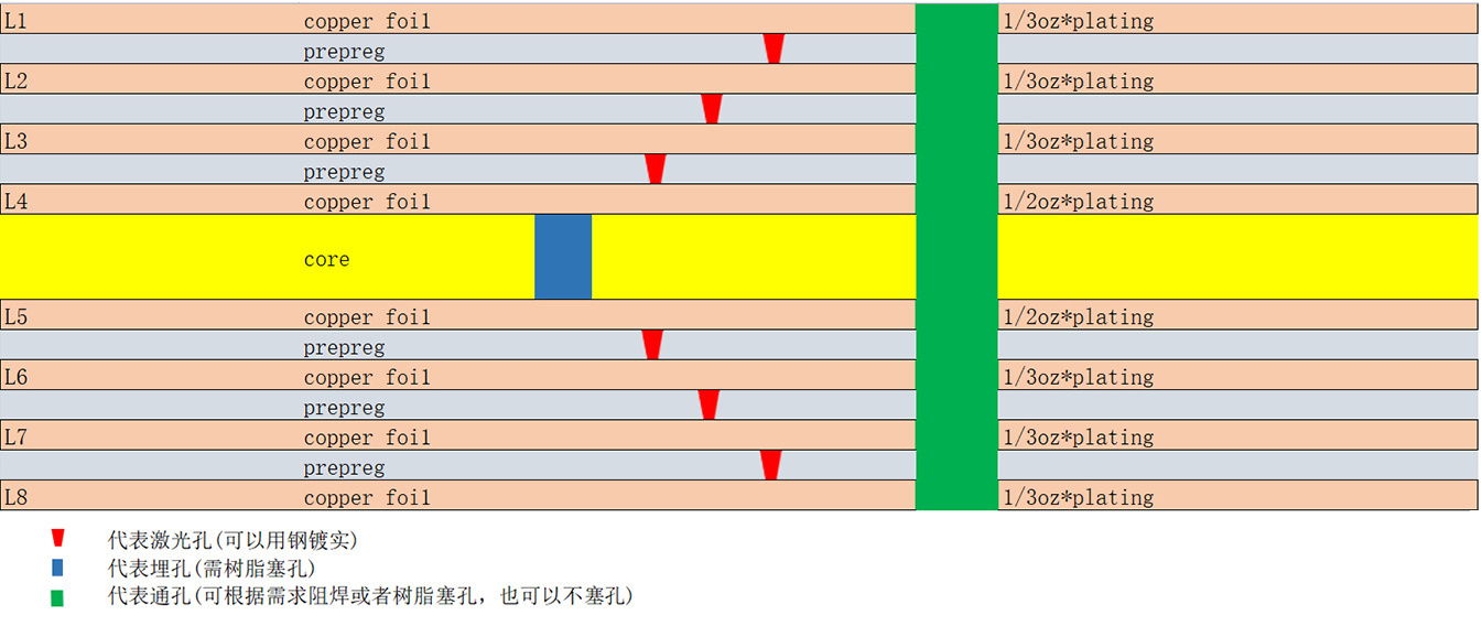 The image below shows a typical HDI board structure. To meet the requirements of HDI board manufacturing, we typically use 1/3 oz or 1/2 oz copper foil. Meanwhile, to ensure that the laser vias can penetrate the interlayer polypropylene (PP), we generally recommend designing the interlayer PP thickness for the laser vias to be < 0.1 mm. Therefore, if you have impedance control requirements and have designed laser vias, you need to consider the impact of thin PP on impedance. If you have any questions in this regard, please feel free to contact us.